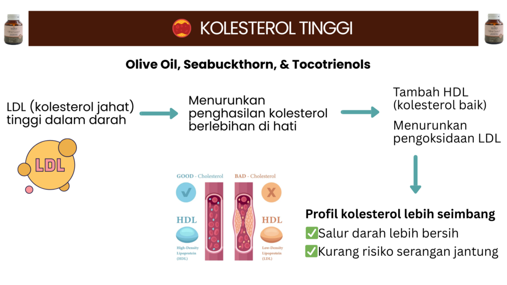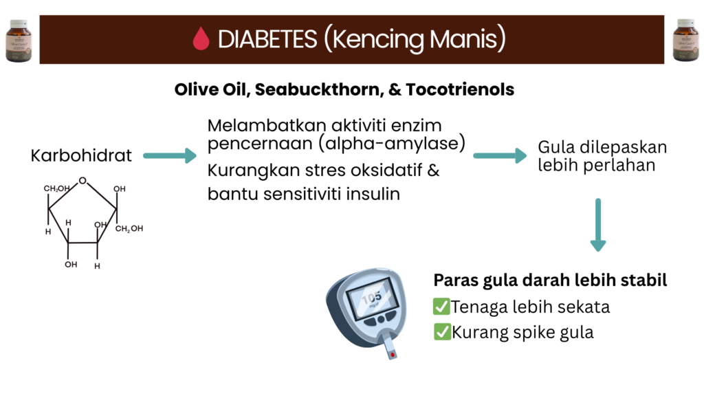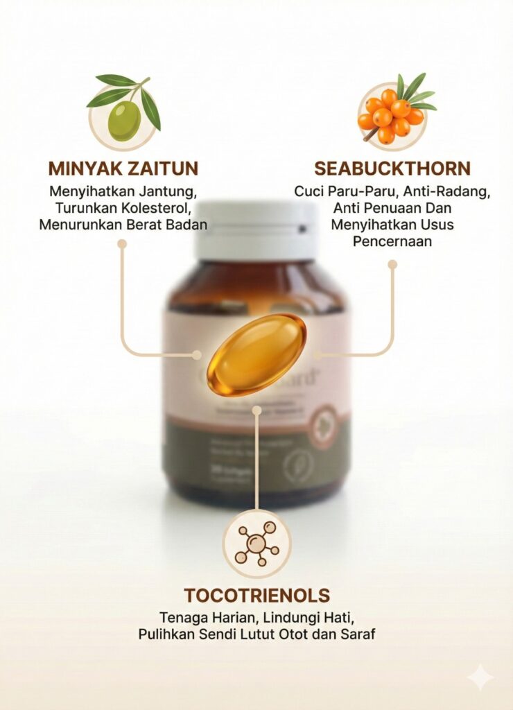 Raudhya OliveGuard+ Diperkaya Bahan Aktif Polyphenols, Tocotrienols (Super Vitamin E ) & Omega Aktif Menyokong Kawalan Gula, Kolesterol & Tekanan Darah